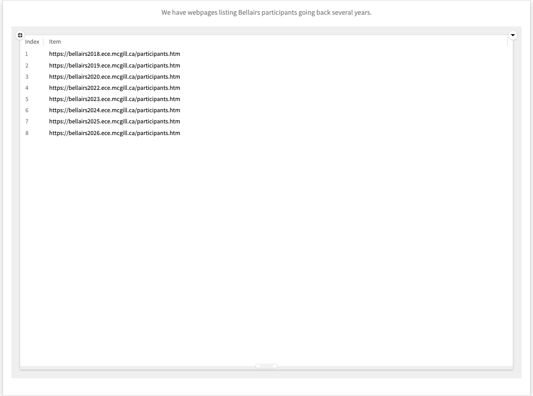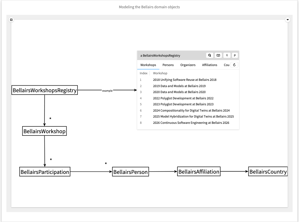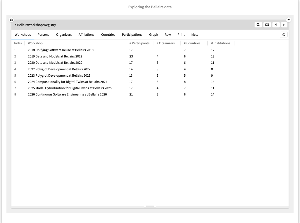Now from the data we'd like to model the following domain entities: The Bellairs registry knows about a bunch of workshops, each of which has a bunch of participations listed on the websites. Each participation is for a person (possibly an organizer) with an affiliation to an institution in some country.