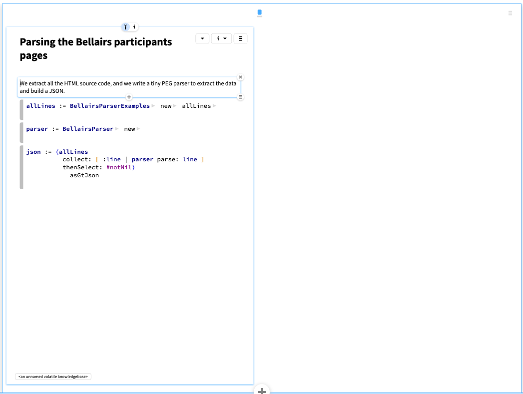 We apply the parser to all the lines, collect the non-empty dictionaries, and turn that into a JSON object. Once again, we are inspecting a GtJson object at the right, decorated with some views specific to JSONs.