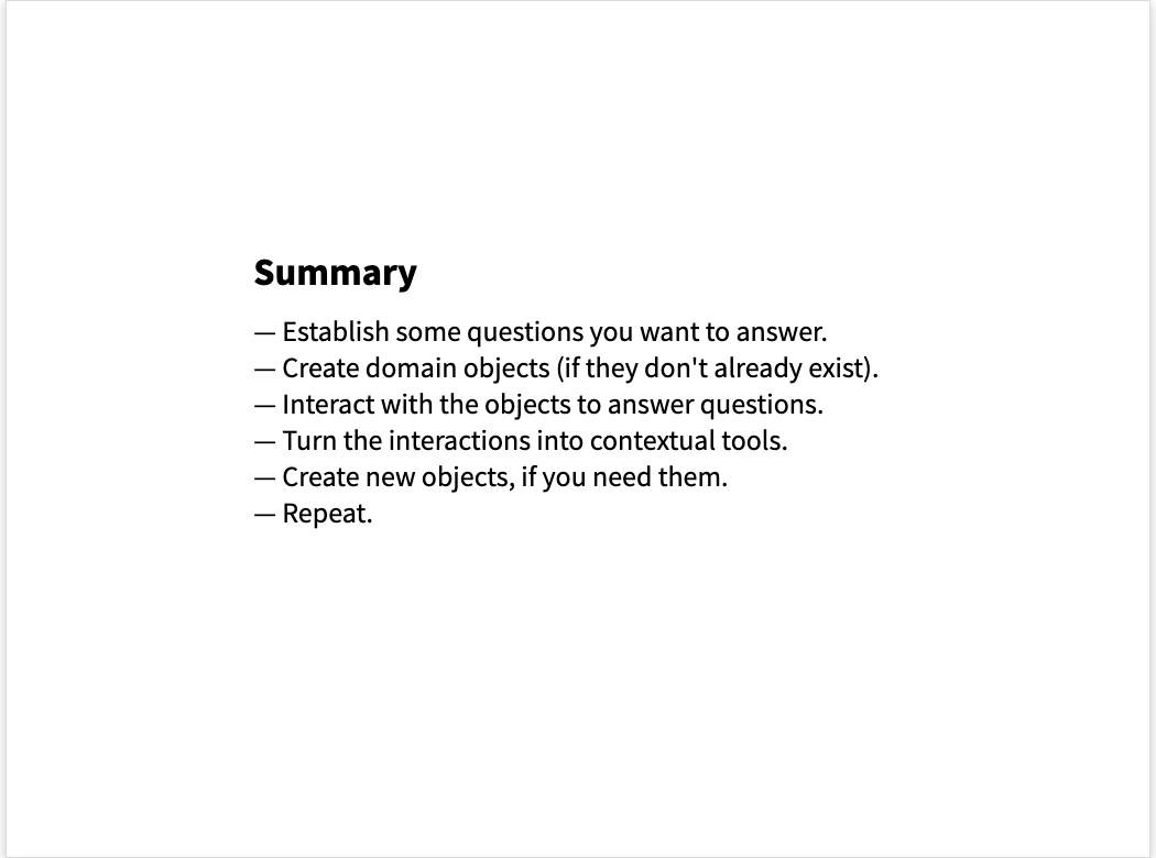 OK, let's take a step back and consider what we have seen. First of all, we wrapped some data to create domain objects. Then we molded these objects to answer questions we had. Note that everything we have seen are just object inspectors on domain objects. Each view is a little, contextual tool.