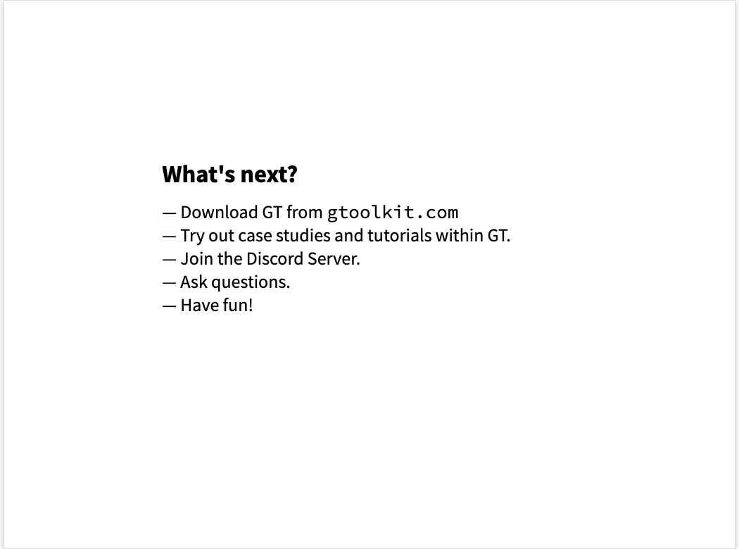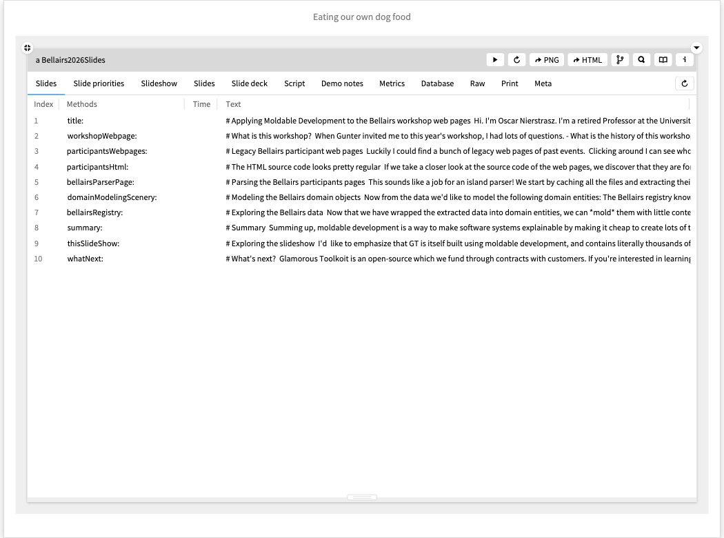 As a closing example, consider that this slideshow itself is just a moldable object within GT. The slideshow authoring environment is nothing but an object inspector on a slideshow instance decorated with contextual views, actions and searches. Here's the code of this slide.